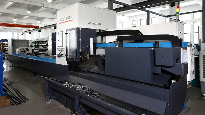 Este taller se encarga del procesamiento inicial de las materias primas. Se utiliza una máquina cortadora de tubos por láser de fibra para cortar materiales con precisión, asegurándose de que cumplan con las especificaciones para la soldadura y el ensamblaje posteriores.
